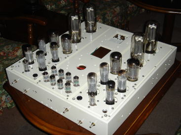 以前、JAZZとオーディオの寺島氏のお宅と、氏の経営される「メグ」で6550パラレルPPの試聴会をさせて頂いた時、宅配でも送れるように、真っ黒なケースに組み込んだアンプをみて、これでは・・・・・と言われました。確かにオーディオマニアからすれば致し方ない。これまで自分のアンプは穴あけ、塗装、レタリングはやっていましたが、プリ2台?を除けばシャーシーは市販品でした。暫くすると必ず改良が始まるからですが、まあ自分のも一台ぐらいという思いと、今回は、回路的にも自分なりに最終段階にあり、二度と製作しない?大型のアンプということもあり奮発して特注しました。写真ではただ白っぽいですが、薄いグレー系の艶ありで、飽きのこない品の良い感じ、と思っています。